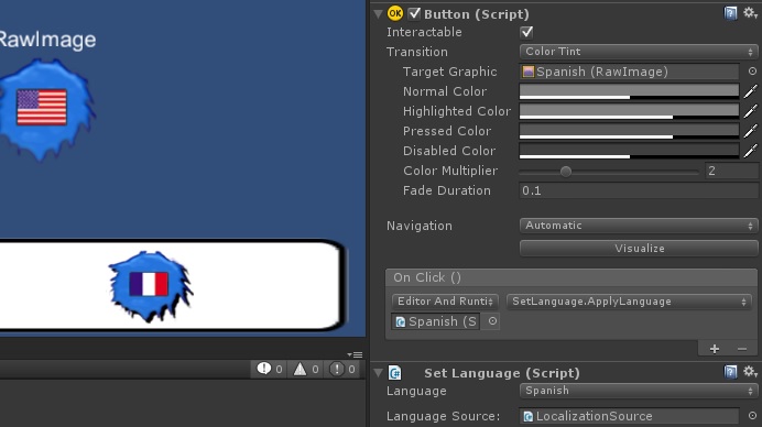 If you are using the Standard Components (like in the tutorial), just add a Button component so that the OnClick method get called. If you are using uGUI, then assign the ApplyLanguage function to the OnClick of the uGUI button.
